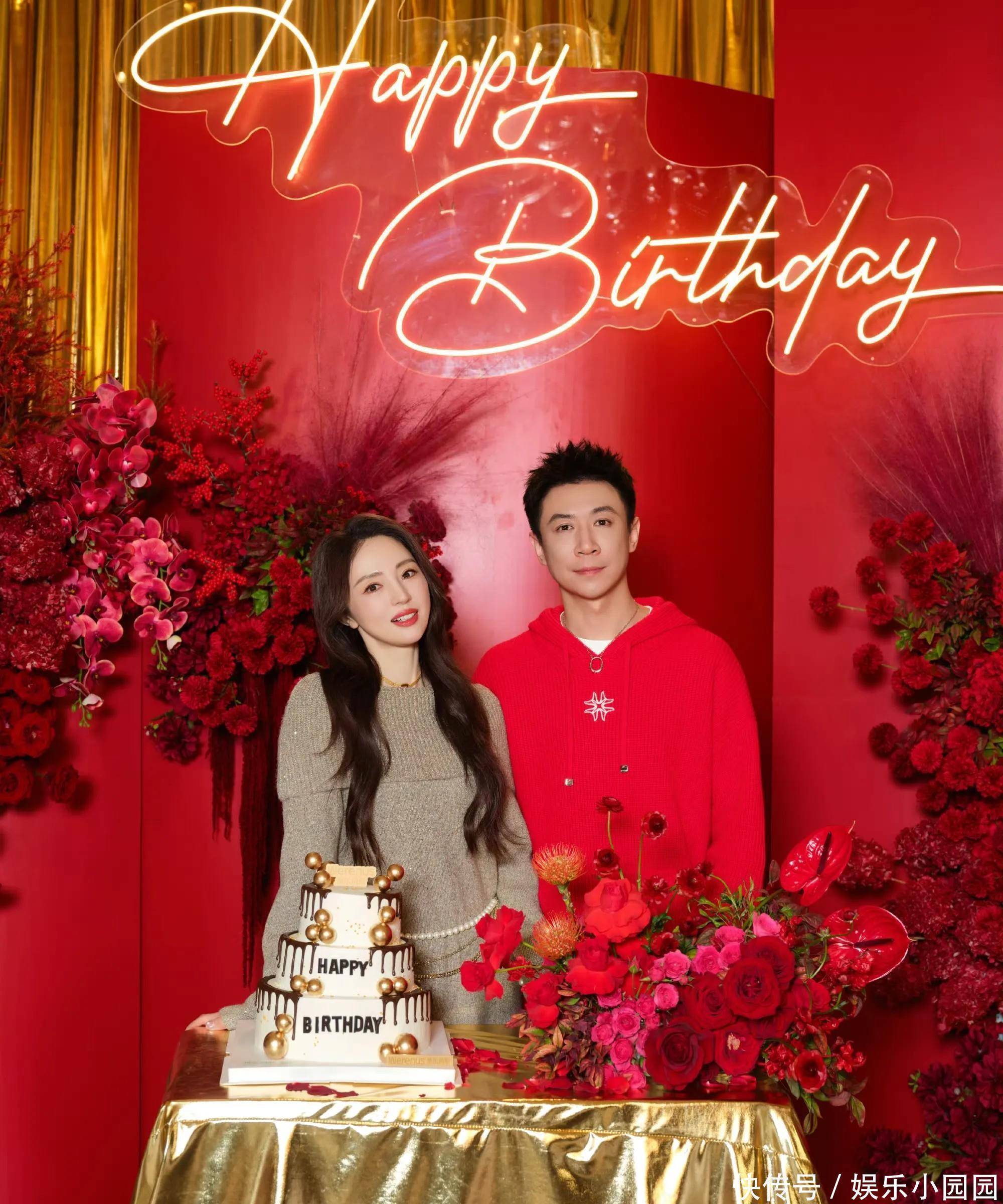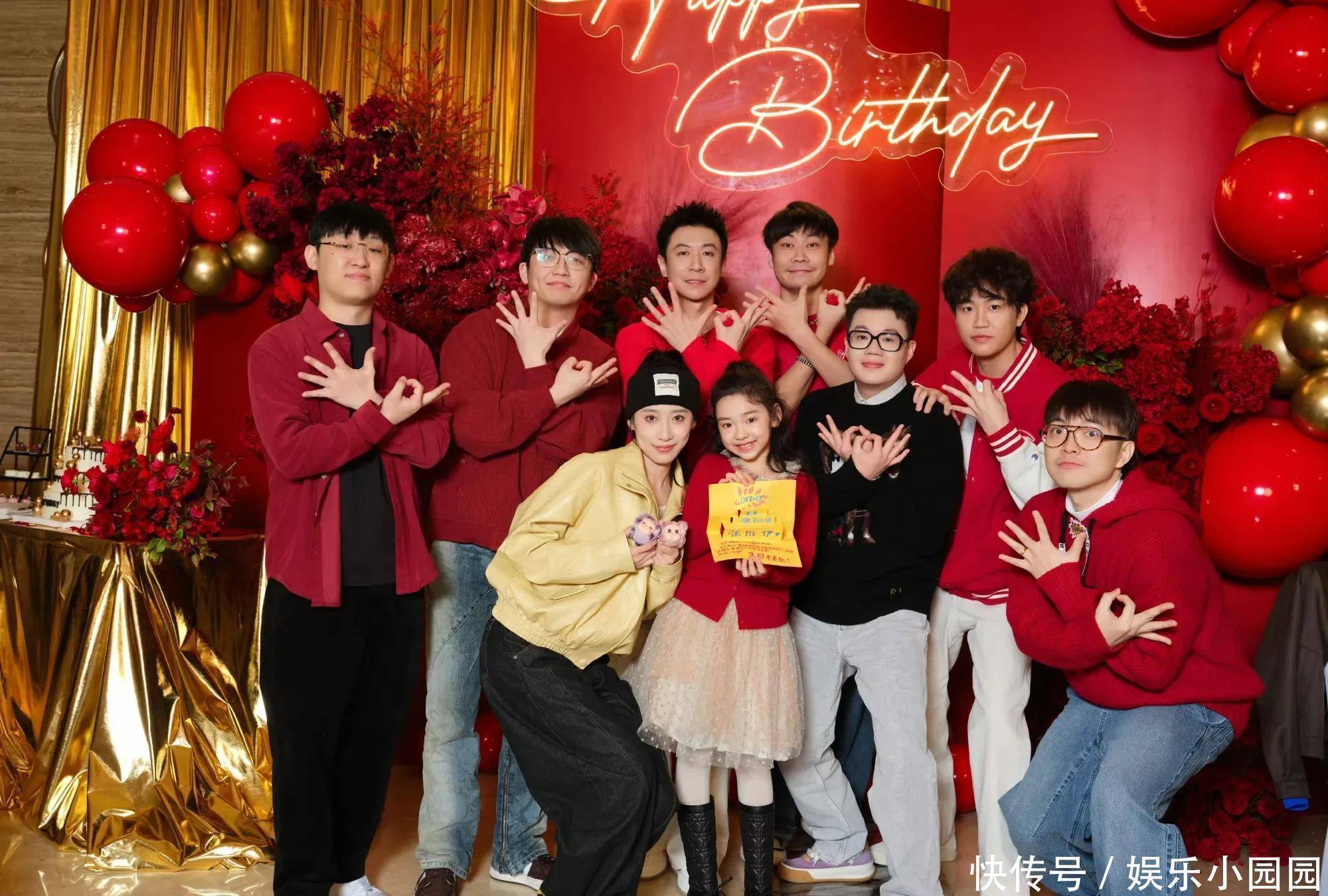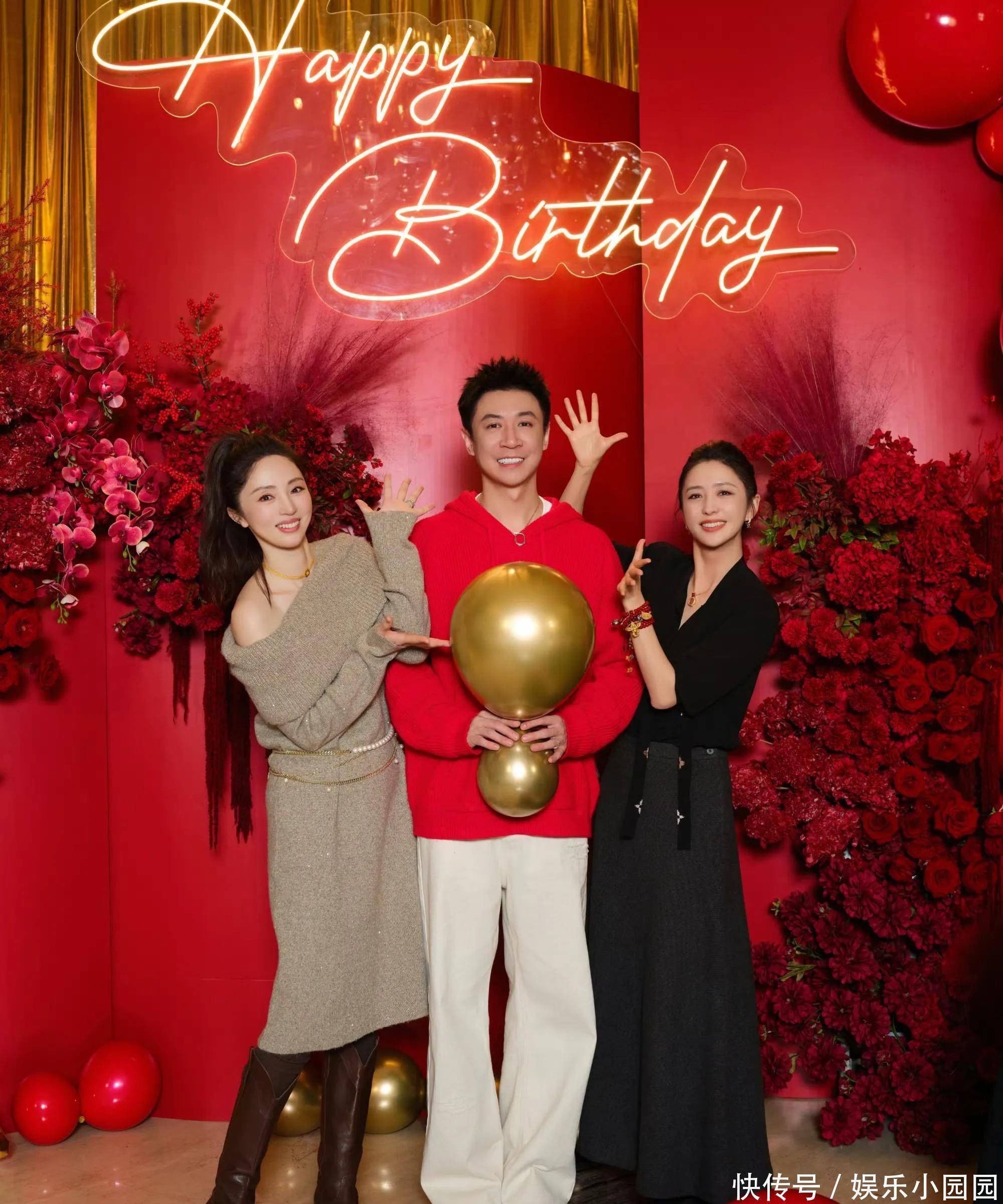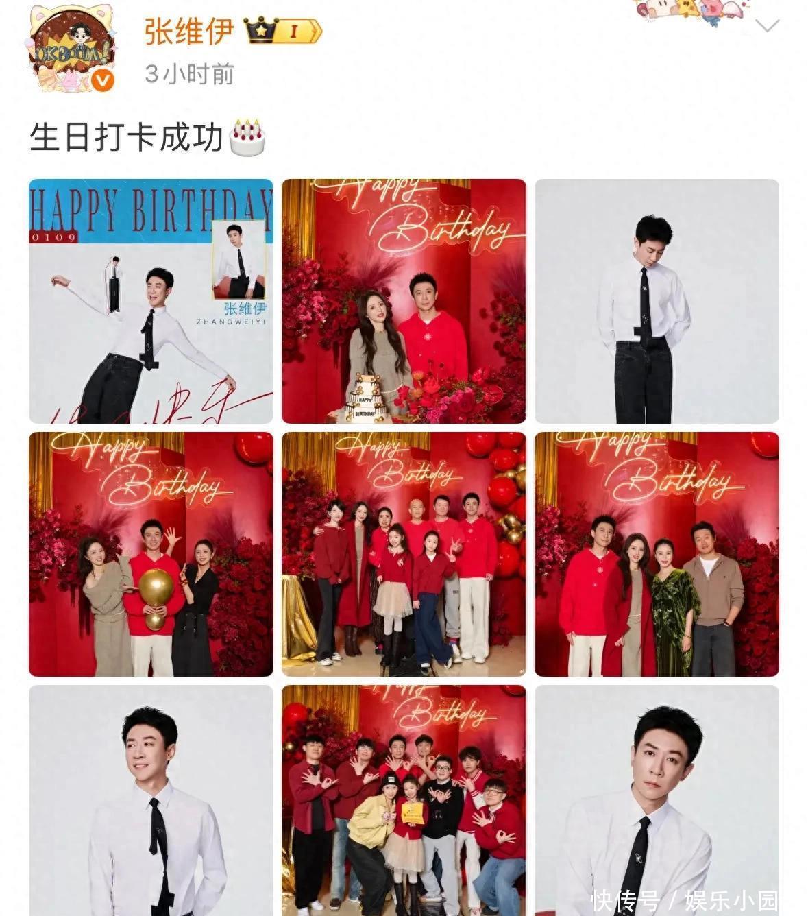生日会现场布置地喜庆热烈,从背景板到装饰气球再到鲜花,全是用的大红色。寿星张维伊穿着大红色卫衣白色裤子,发型清爽利落,站姿挺拔,整个人清爽不油腻,看上去顺眼多了。